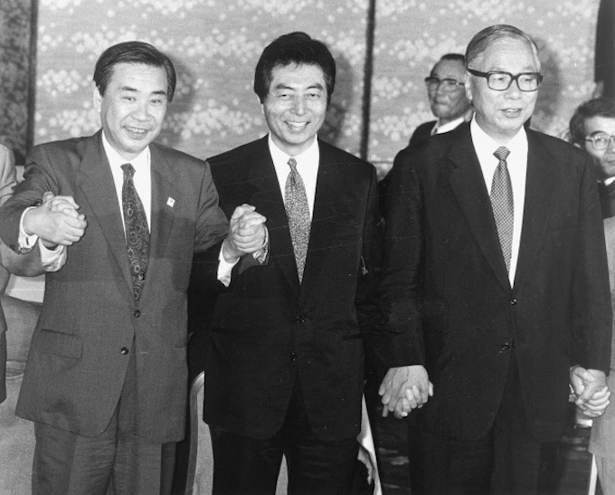 羽田は、細川同様「新生党」を、元滋賀県知事の武村正義は「新党さきがけ」をそれぞれ結党していました。「新党ブーム」で誕生したこれら非自民系政党の大連立により、細川は首相に担ぎあげられ、1993年、細川大連立内閣が誕生したのです。参加した政党は日本新党・新生党・新党さきがけ・社会党・公明党・民社党・社会民主連合の8党。自由民主党は結党以来初めて野党に回り、ここに55年体制は崩壊したのでした。