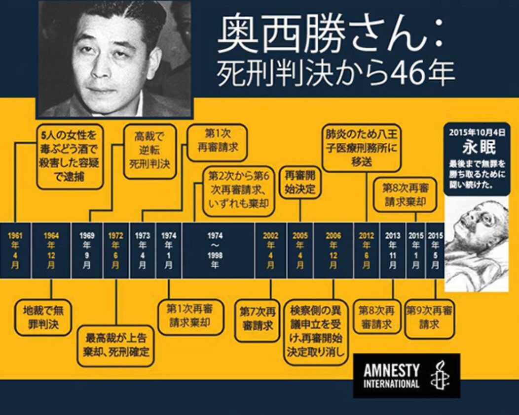 警察は執拗な自白を強要したとされ、奥西さんと支援団体は生前9度にわたる再審請求を要求。彼は無実を訴え続けたものの、死刑判決から43年後に89歳で死亡しています。
