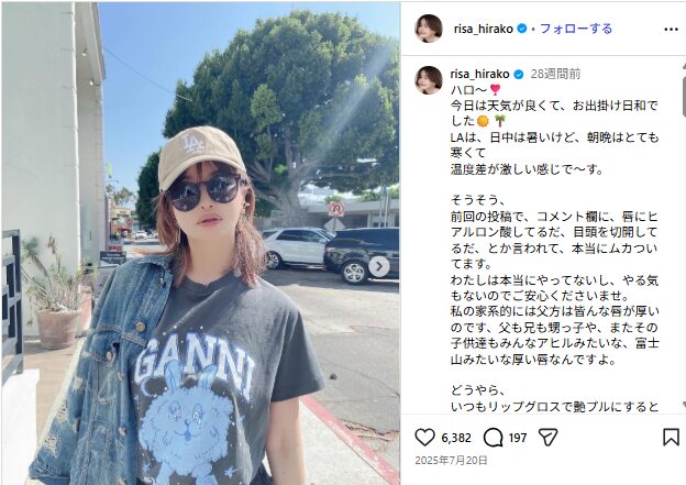 しかし彼女は、2025年の7月に整形疑惑を否定。「わたしは本当にやってないし、やる気もないのでご安心くださいませ」と投稿しています。唇は元々大きく、リップをつけるとヒアルロン酸を入れていると間違われるのだそう。