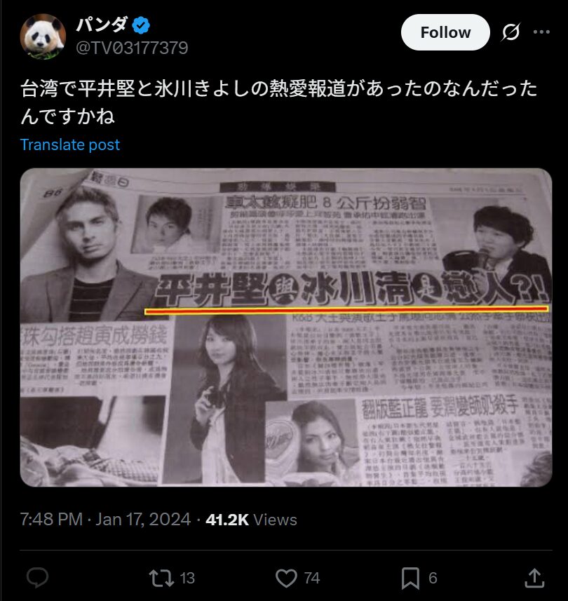 また2006年には、演歌歌手の氷川きよしさんと台湾での手つなぎデートもスクープされました。そして2024年に氷川きよしさんと海外で同棲しているという噂も流れましたが、これはデマである可能性が高いようです。