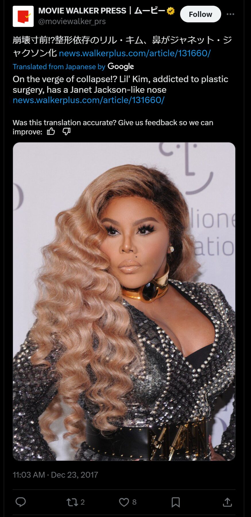 このように顔を変化させた理由はわかっていませんが、おそらく東洋の神秘的なイメージに憧れたのでは?といわれているようです。また彼女は定期的に激太りし、2017年には鼻もさらに細くなっていました。