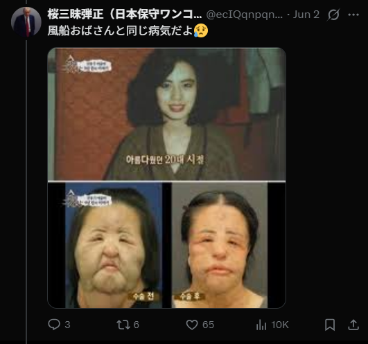 ハン・ヘギョンさんは日本でも「扇風機おばさん」という名前で有名になった韓国人モデル。彼女はいわゆる「闇医者」で遺法の整形手術を受け、工業用油を顔に注入されたために顔が腫れ酷い状態になってしまいました。