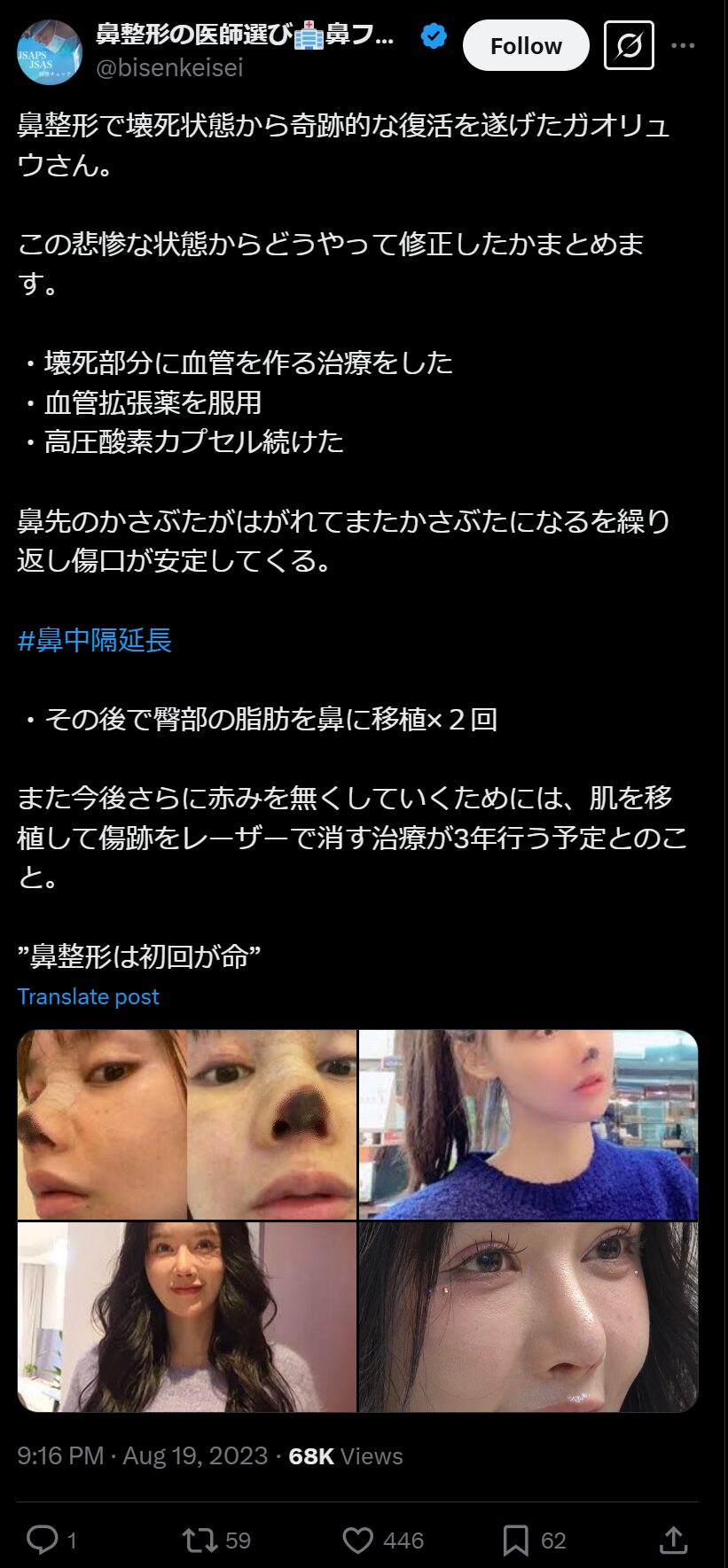 そんなリュウさんは、友人に紹介してもらった美容整形医院で鼻の美容整形を受けたのだそう。そして手術は4時間にも及びましたが、手術失敗により鼻先が壊死してしまいました。当初「鼻がちくちくする」ような違和感があり、その後皮膚復元手術を2回受けたといいます。