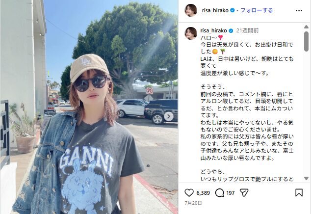 整形が噂されていた平子理沙さんですが、2025年7月に投稿されたInstagramで整形疑惑を否定しています。唇は家系的に元々大きいのだそうで、リップをつけると疑われるのだそう。長年の整形疑惑を否定し「すっきりした」と投稿し、長年の整形疑惑に終止符をうっています。