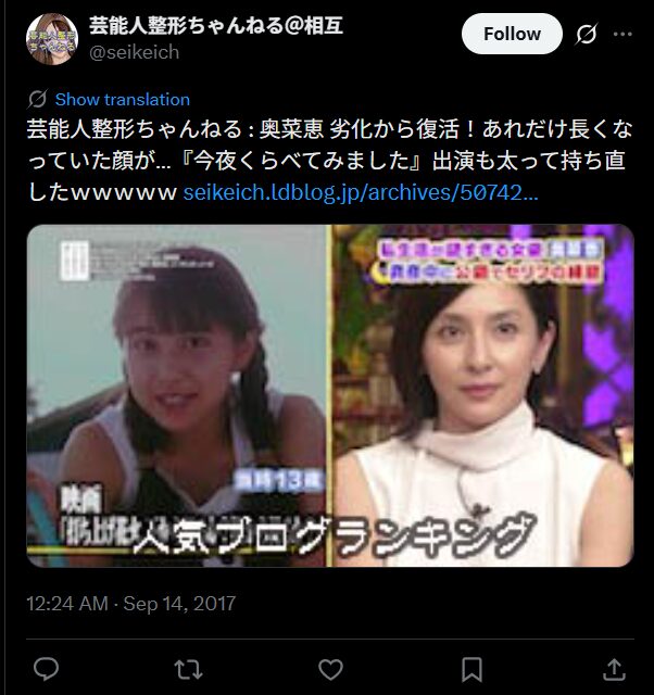 奥菜恵さんは90年代に清純派女優として活躍した人物。彼女は近年、若い頃に比べて「老けた」「劣化した」といわれているようです。そして昔の写真と見比べてみると、目元がぱっちりしており、頬が痩せてしまった印象を受けます。