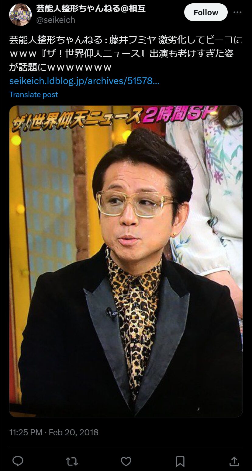 写真を見てみると、現在60代である藤井さんの年齢を考えると年相応では?とも思いますが、老けた印象は否めません。童顔であったために、年を取ると印象が変わってしまった印象です。急激に老けたという理由の1つには、藤井さんのファッションも関係しているといわれています。
