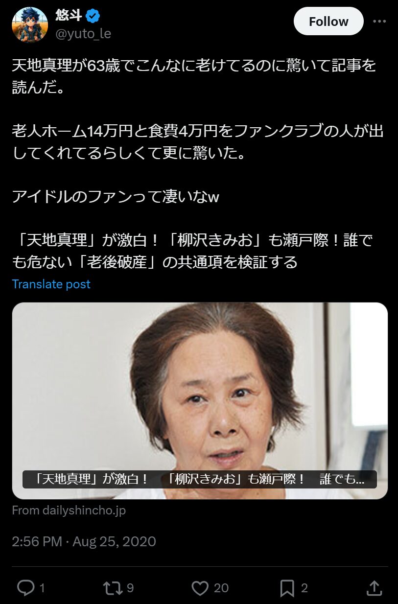 天地真理さんは70年代前半に一世を風靡したアイドル歌手。彼女は2015年に川崎の老人ホームに入居していることがスクープされ、その時にすっぴん写真が掲載され世間を驚かせました。老人ホーム暮らしになったのは、天地さんのお金遣いの荒さが原因だったそうです。