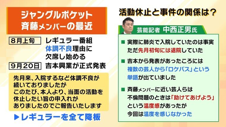 斉藤は重度のギャンブル依存症で、芸人仲間や知人から金を借りてはギャンブルにつぎ込んでおり、吉本興業も治療プログラムを受けさせようとしていたという。