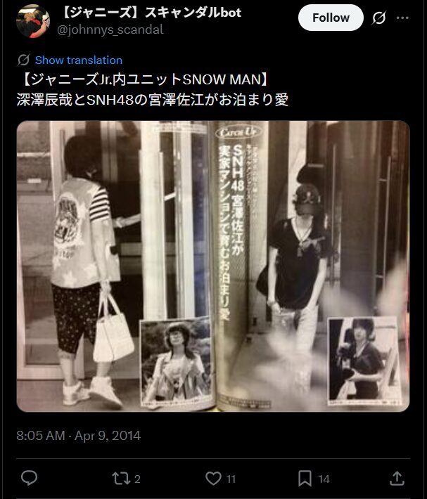 アイドルグループ「SnowMan」のメンバーである深澤辰哉さんとSNH48の元メンバーである宮澤佐江さんは、2013年に交際がスクープされました。週刊文春では頻繁に宮澤さんの家族が暮らすマンションに出入りしており、お泊りデートを報じています。