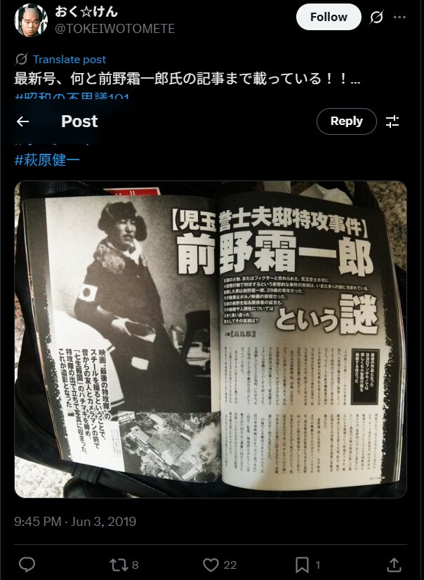 前野さんは「撮影のため」といい、特攻隊員の服を着て「七生報国」と書かれた日の丸の鉢巻きを付けて記念撮影。その後飛び立ち、無線通信で「天皇陛下万歳」と言い交信が途絶えたといいます。前野さんの自爆テロ行為をアメリカメディアは、「最後のカミカゼ」と報道したそうです。