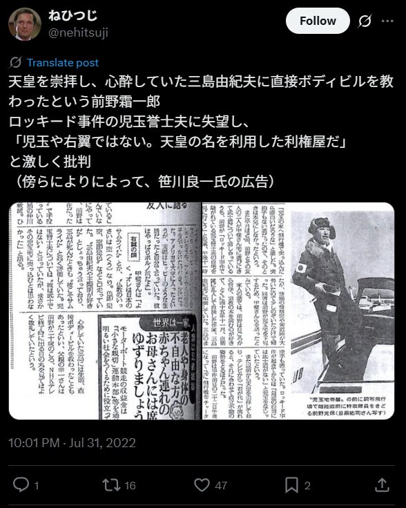 前野霜一郎さんは日活ロマンポルノで活躍していた俳優。彼は1976年に日本の右翼運動家・児玉誉士夫氏の邸宅に小型飛行機で突入し死亡しています。機体の中で死亡が確認され、享年29歳でした。