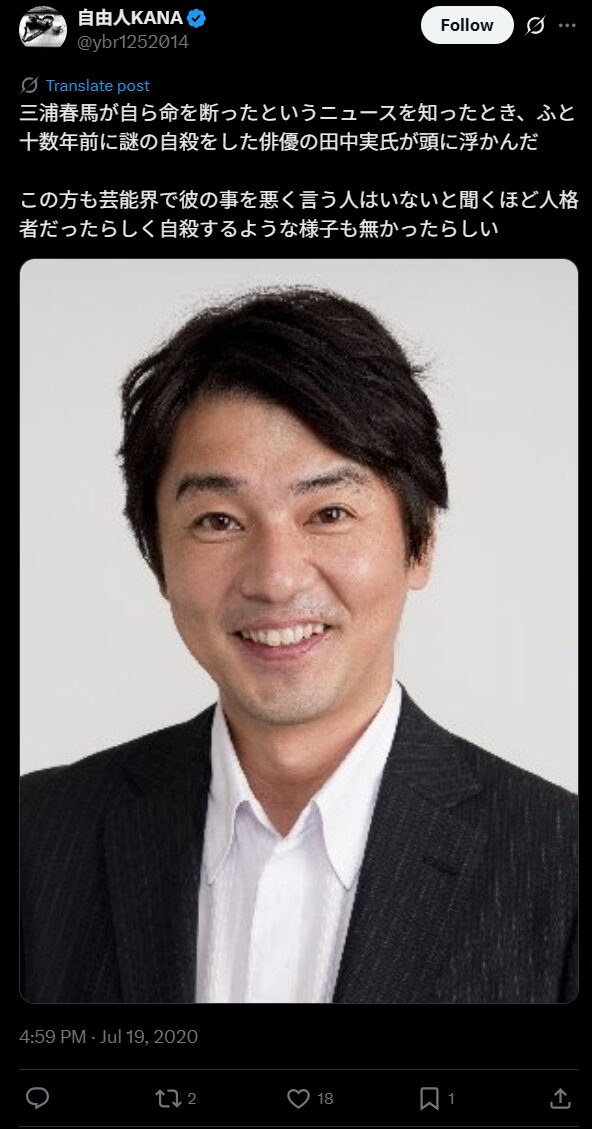 田中実さんは1990年のNHK連続ドラマテレビ小説「凛凛と」で主役を演じた俳優。彼は2011年4月25日に、大田区の自宅で首を吊って自殺しました。享年44歳。病院に搬送された際には、既に息を引き取っており、担架に運ばれる田中さんの顔は蒼白だったそうです。