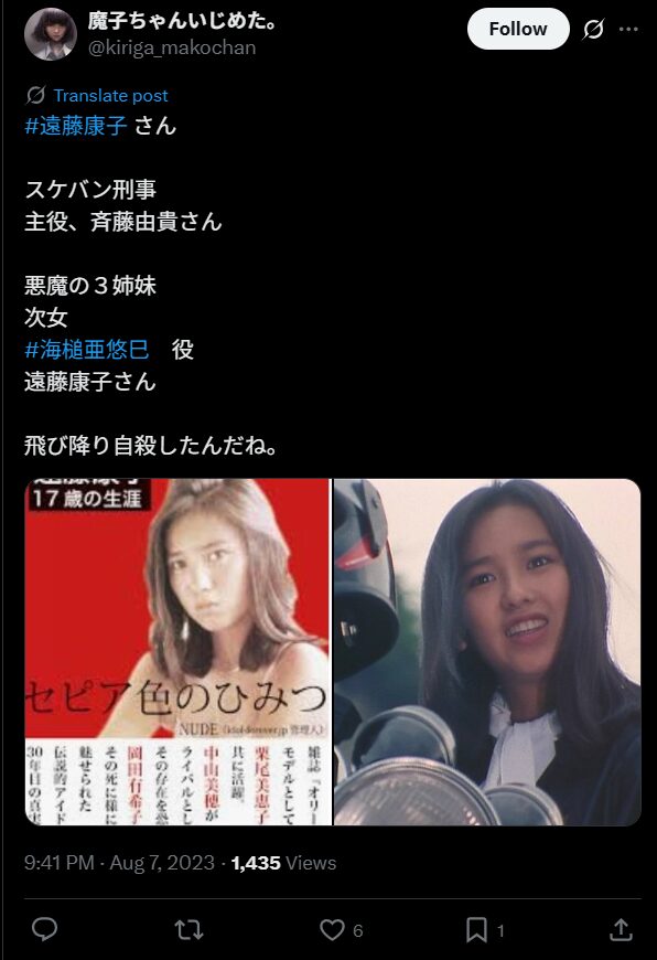 遠藤康子さんは「スケバン刑事」で悪役を演じた女優。彼女は1986年に台東区浅草橋のビル屋上7階から飛び降り自殺しています。享年17歳であり、アイドルデビューが2か月後に控えていた時の出来事でした。