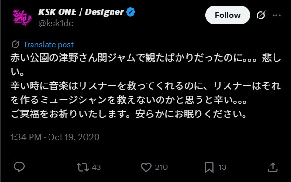 津野さんが死去した2020年はコロナ禍の中であり、芸能界でも自殺者が多かった時期でもありました。コロナによりバンド生活が不安定になったためなのか真相はわかりませんが、早すぎる死を悼む声が多く寄せられています。