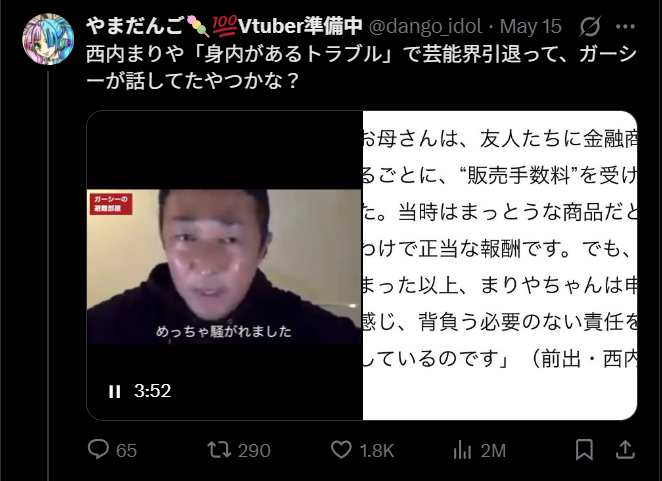 西内まりやはモデルとして活躍し、2014年には歌手として「日本レコード大賞新人賞」を受賞している人物。ガーシーは西内まりやさんの母親が、「詐欺の被害者であり加害者だった」と暴露しています。詐欺が起きた時期は、2015年秋頃の事でした。