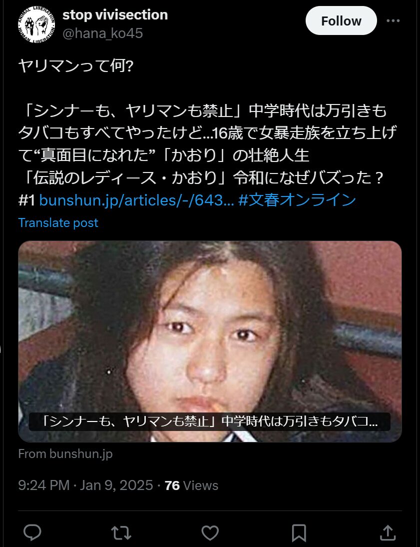 かおりさんは90年代に暴走族雑誌「ティーンズロード」で人気を博した人物。彼女は栃木県に拠点を置いていたレディース暴走族「北関東硬派連盟貴族院女族」の2代目総長で、当時暴走族の間でカリスマ的な存在でした。総長の座は先輩に譲ったものの、彼女が事実上の発起人です。