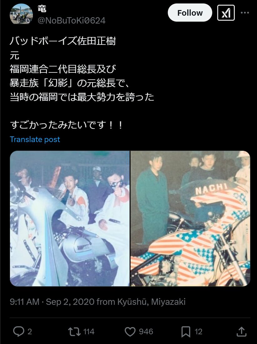 中学の頃には既に刺青を入れ、時計店の窃盗するなど、その前から危険な人物ではありました。高校入学後は上級生と30対30で勝負し、佐田さん側下級生が勝利。福岡のヤンキーの間でも有名な存在となりました。