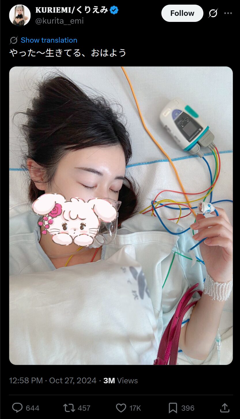 AI以外にも美容医療開発・AGAケア事業の会社も立ち上げているくりえみさん。そんな彼女ですが、2024年には3度も大きな手術をしており、10月には体の一部を除去する大手術をしたということです。病名は明かされていませんが、完治するには背中に大きな傷が残るとのこと。