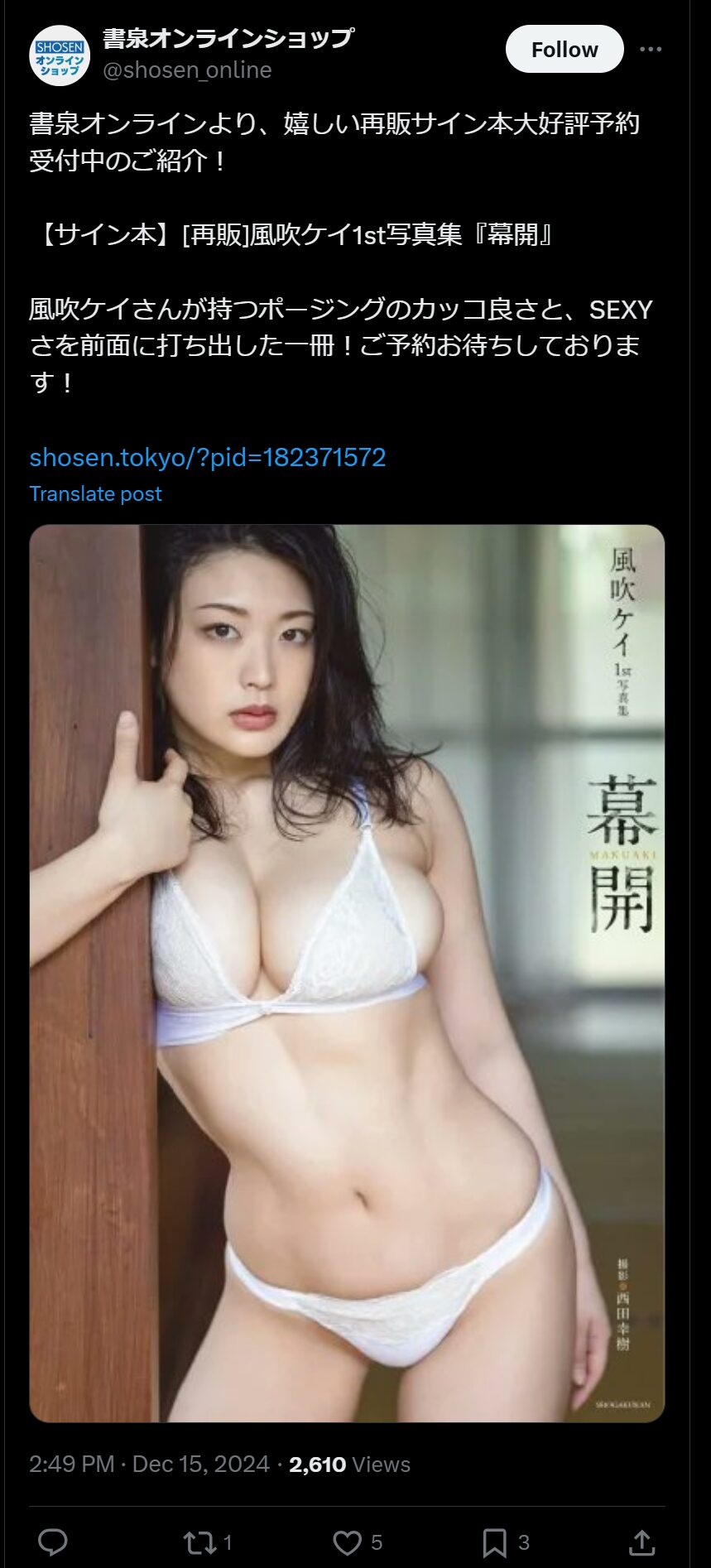 2023年にファースト写真集「幕開」を発表。極限まで露出した過激度マックスな写真が満載であり、Jカップの胸を惜しげもなく見せてファンを魅せています。さらに割れた腹筋も持ち合わせており、ファンからは「たまらん」「すごすぎて素晴らしい!」と絶賛されている存在です。