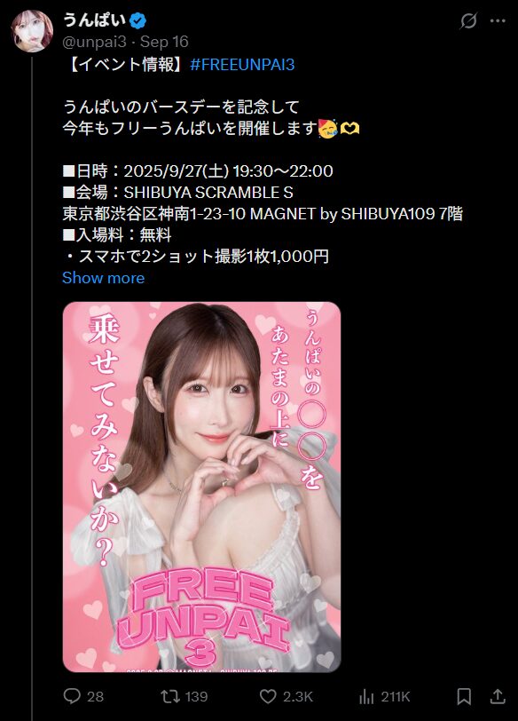 うんぱいさんはTikTokの登録者数が400万人以上のセクシー系インフルエンサーでありグラビアアイドル。彼女は2019年にグラビアデビューし、2022年にAVデビューしています。デビュー作はFANZAフロア週間ランキング1位を獲得。2025年現在も精力的に活動しています。