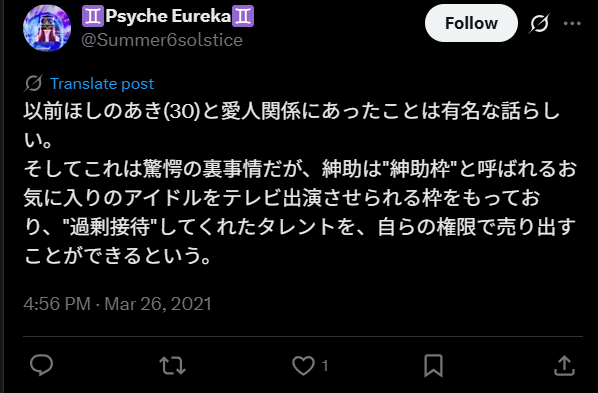 そんなほしのさんは2008年に「島田紳助に捨てられた」と六本木のバーで号泣してた目撃談があるとのこと。業界関係者の中には「島田紳助さんの名前を使ってやりたい放題だった」と話していたともいい、島田さんが引退してからはペニオク疑惑によりテレビで見かけなくなってしまいました。