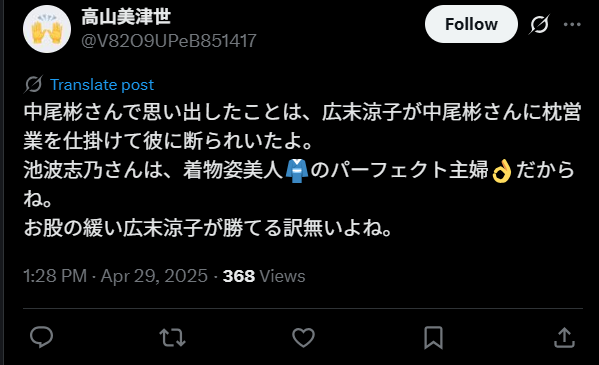 枕営業で大きな仕事を取りまくるために「枕女王」と陰口されることも。2000年頃に俳優の中尾彬さんが広末さんのファンであったために食事に誘うと、