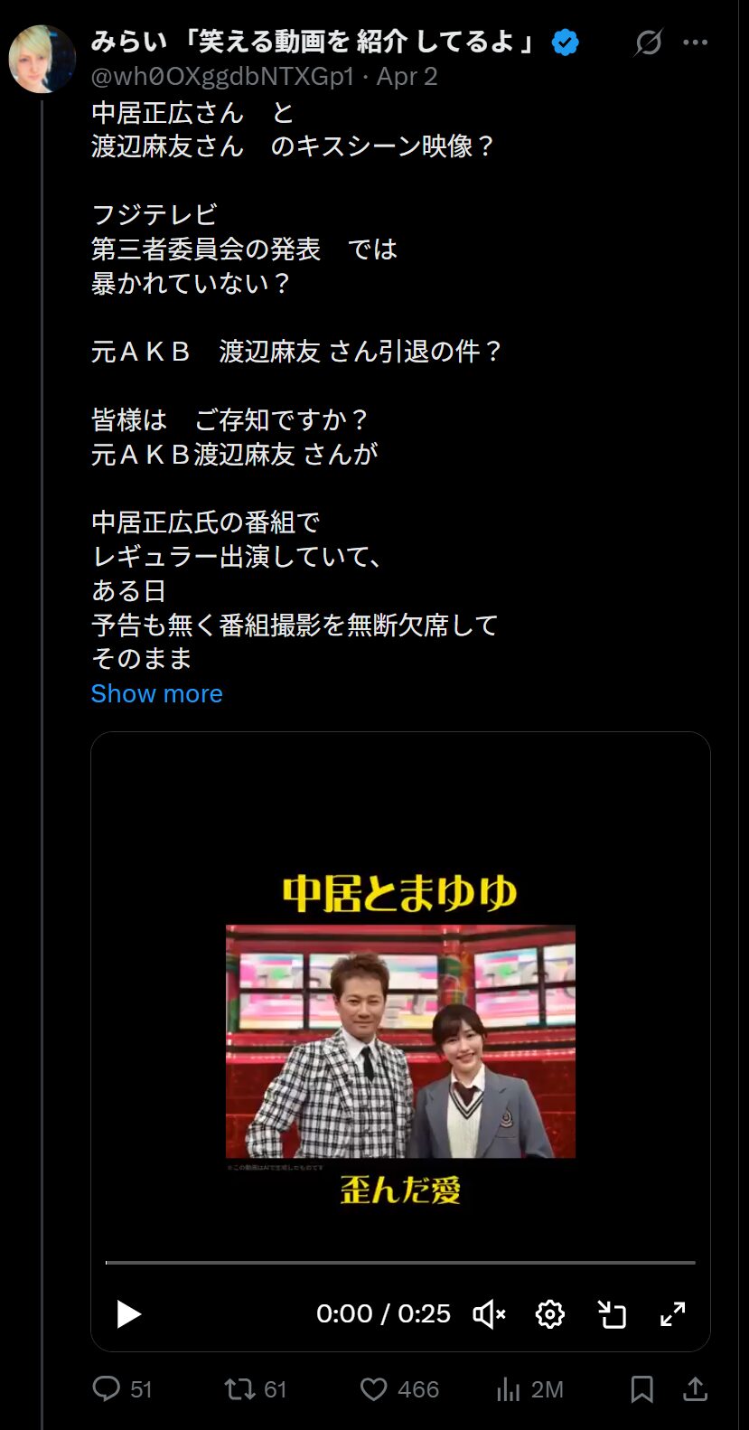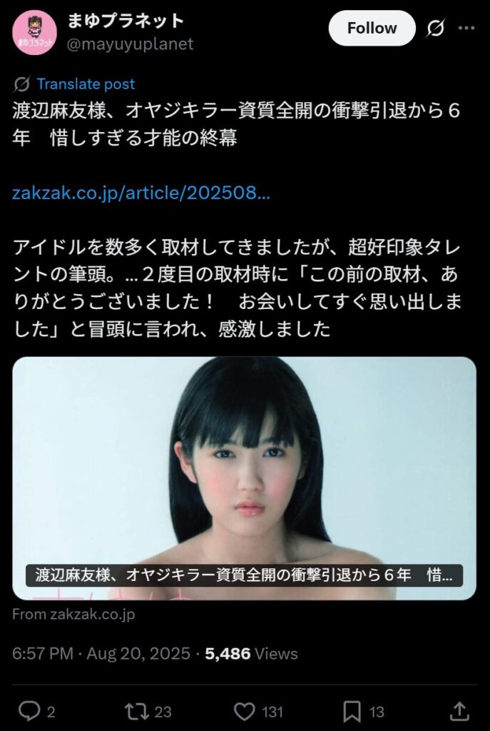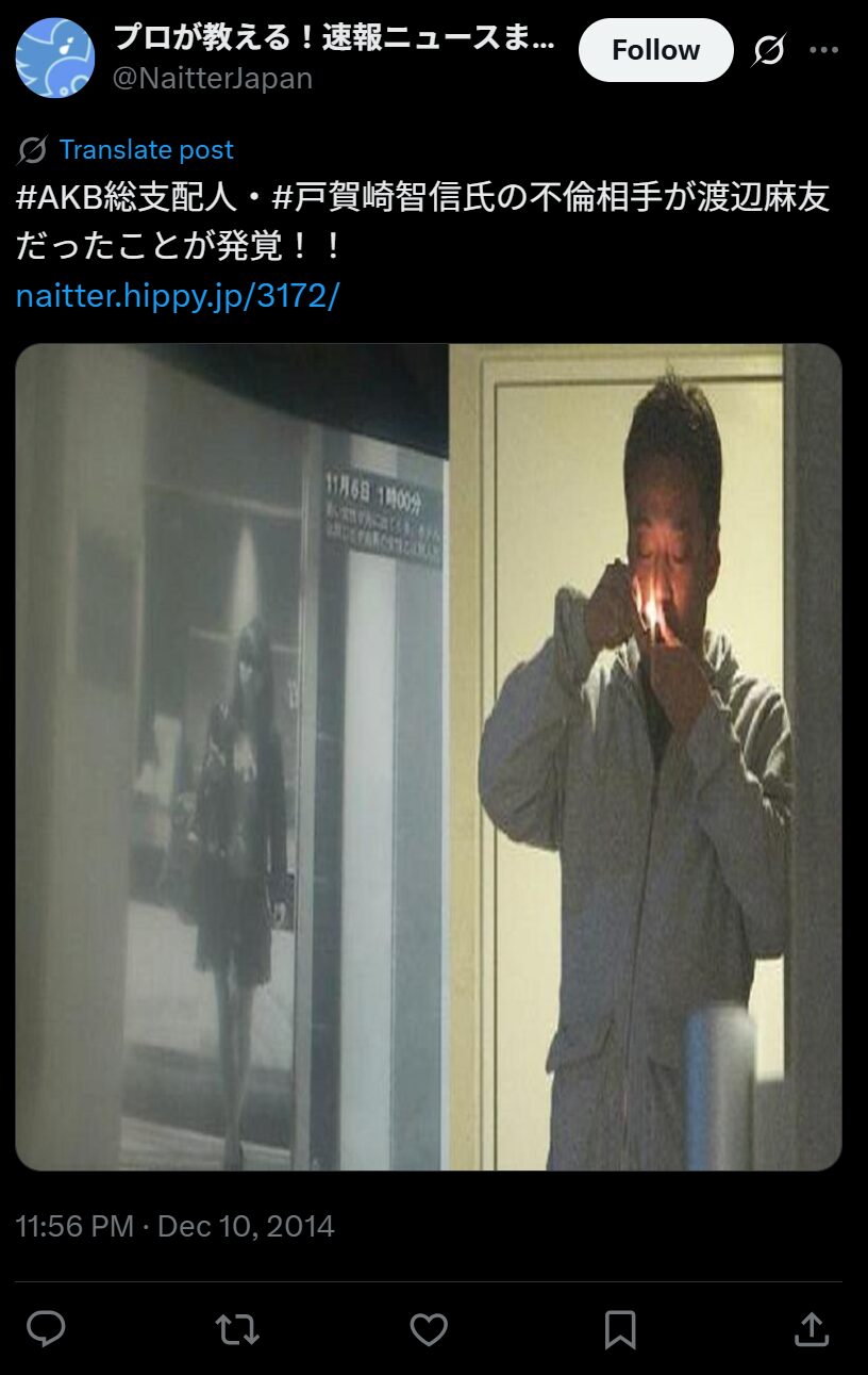 渡辺麻友はアイドルグループ「AKB48」の元メンバーであり清純派といわれていた人物。彼女はAKB支配人の戸賀崎智信氏との不倫スキャンダルがスクープされています。