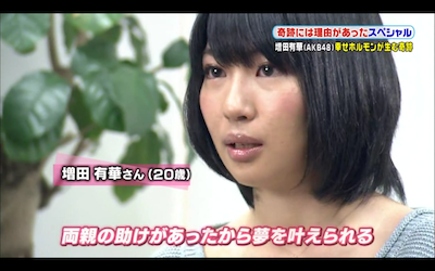 増田有華さんは、2013年までAKB48に所属していた元アイドル。彼女は、2歳の頃に免疫機能不全により小児がんを患い、腎臓、膵臓、肝臓など14カ所に転移があったそうです。この状況下、両親は歌が好きな増田さんのため、病室で歌やギターで励ましていました。