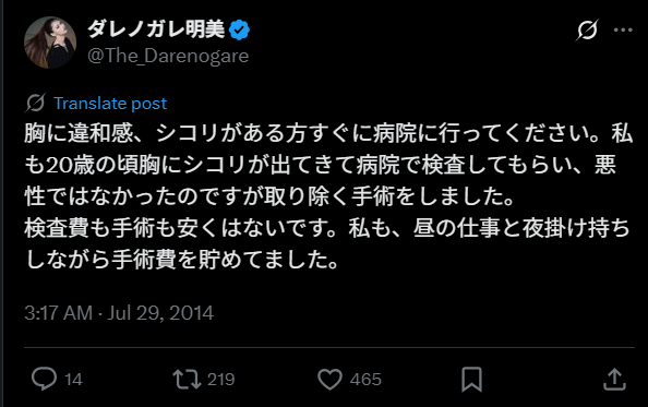 ダレノガレさんは夜の仕事をしていたことを認めており、「自分の手術代を稼ぐため」と話していたとのこと。当時胸にしこりがあったといい、手術で除去したといいます。元々好感度キャラでも無かったために、ネット上では