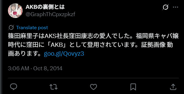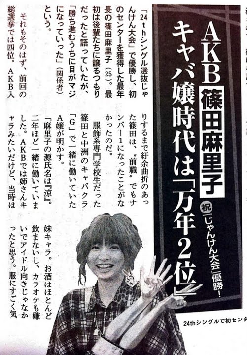 篠田麻里子さんはアイドルグループ「AKB48」の神7の1人と呼ばれた人物。彼女はAKB48に加入する前に福岡・中洲でキャバ嬢をしていたと2011年に文春で報じられました。