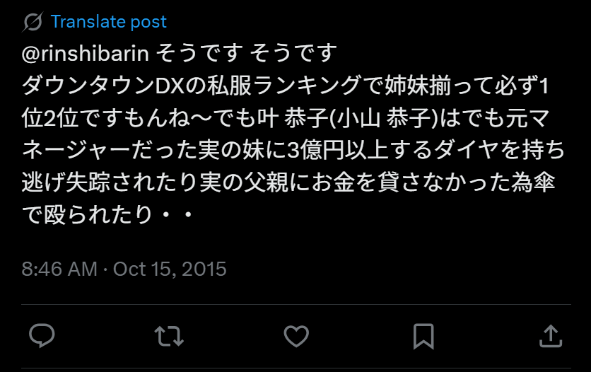 本には恭子さんが家庭内暴力をふるっていたことや、浮気についても書かれていたようです。ゴージャキャラで売っている恭子さんですが、2007年には自宅駐車場で実父に暴行を受ける騒動や、同年に妹の春栄さんが恭子さんの金品を持ち逃げする事件を起こしています。