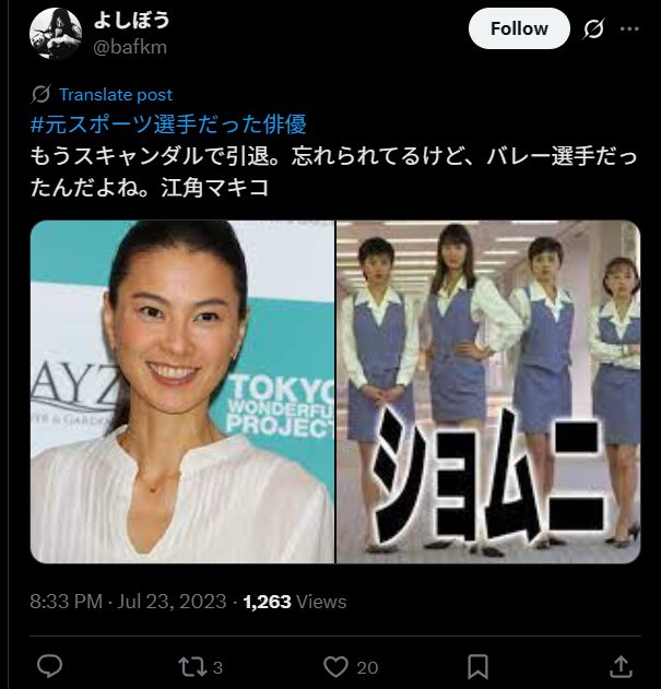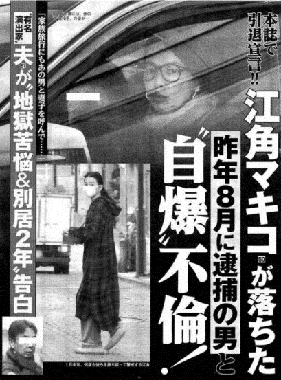 江角マキコさんは「ショムニ」などに出演していた女優。彼女は2017年に週刊誌により不倫写真がスクープされ芸能界を引退しました。不倫相手と言われた人物は投資詐欺容疑で逮捕された人物であり、その人物と都内のマンションに6時間以上こもっていたところを撮影されたといいます。