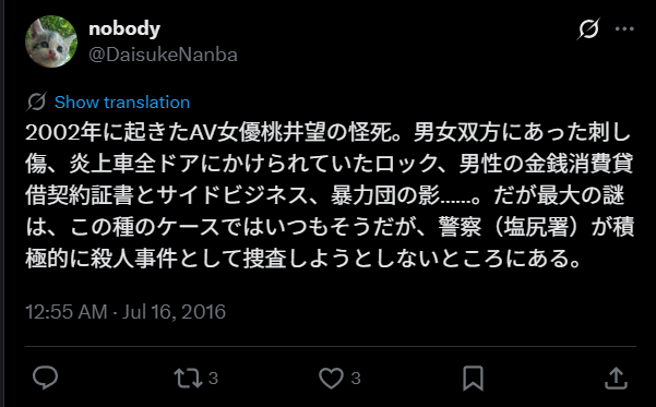 彼女はJR新宿駅でスカウトされ、AV事務所社長と同棲していたとのこと。その後は順調に人気も出てき始めていた時に起きた矢先の事件だったようです。2002年に長野県塩尻市に流れる奈良井川の河川敷で乗用車が燃えていると通報がありました。