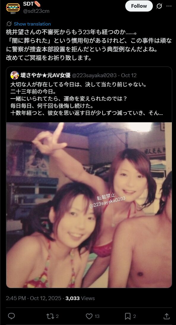 桃井望さんはロリータ系ジャンルで活躍していた女優。彼女は2002年に不審死を遂げています。彼女は「アベック焼死事件」と呼ばれる事件により、24歳の若さで死去しました。死因は刃物による失血死だったそうです。