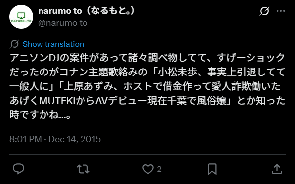 上原あずみさんは名探偵コナンのエンディング「青い青いこの地球に」などを歌ったアーティスト。彼女は問題行為により事務所を解雇になった後に、2010年に「AZUMI」名義でAVデビューしています。約1年間活躍しましたが、引退し現在消息不明となっています。