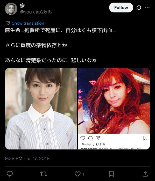 この頃、当時交際していた彼氏と、逮捕されてから半年後には覚せい剤の売人をしていたという話も。麻生さんは2018年に2度目の逮捕されていますが、その時に交際相手も逮捕されていたようです。彼女は約150日間勾留されていましたが、この時に「くも膜下出血」と「死産」を経験したとのこと。