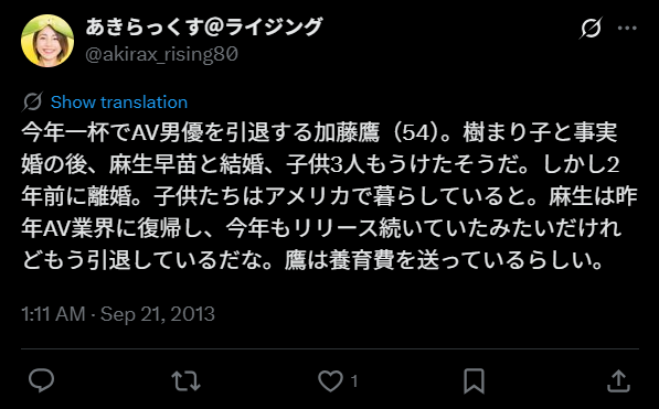麻生さんは3人の子供と共にアメリカに在住しており、加藤さんは仕送りを送っているとのこと。2人の子供の長男はサッカー選手として活躍しており、娘は子役として出演したりもしているようです。麻生さんは2012年にAV復帰しましたが、現在は更新していません。