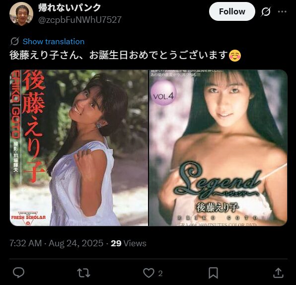 後藤えり子さんはアイドルのような容姿で80年代〜90年代にかけて活躍したセクシー女優。彼女は2003年までAVに出演していましたが、その後は浅草でストリッパーになるなど波乱万丈な人生を歩んでいます。