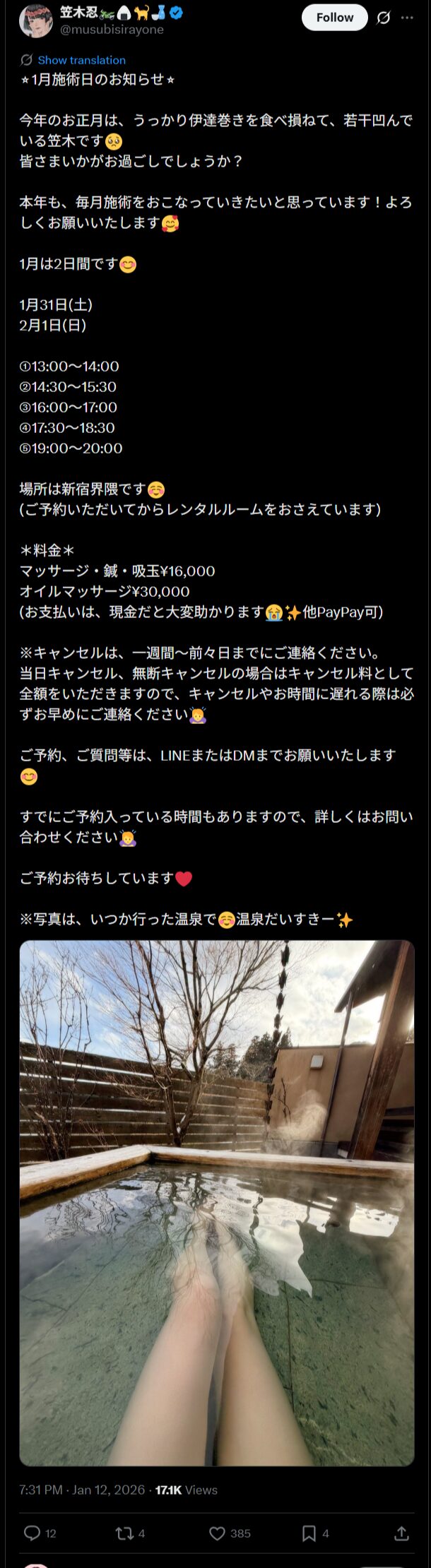 この頃にはスナックに勤めていたようですが、スナックの空き時間の暇つぶしにツイートしていたとのこと。2026年現在は按摩師となっており、定期的にファン会も開催している様子です。