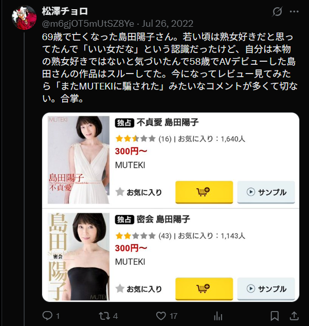 AVにデビューした時には57歳でしたが、熟女好きには喜ばれたようです。AV出演までした島田さんですが、死去するまで借金問題は解決しておらず、ファンと金銭トラブルを起こしたり金銭問題で親族と絶縁状態といったスキャンダルが続きました。