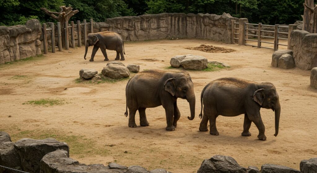 象舎に近づくと、まず目に飛び込んできたのは、立派な屋外展示場でした。広々とした敷地に人工の池、そして大きな日陰を作る人工岩。設備は申し分ありません。