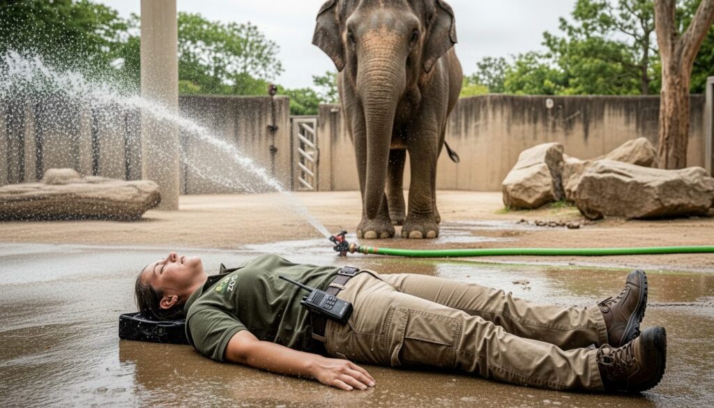 いつものように象舎の清掃をしていた時のことです。高圧洗浄機のホースが足に絡まって、私は勢いよく転倒してしまいました。