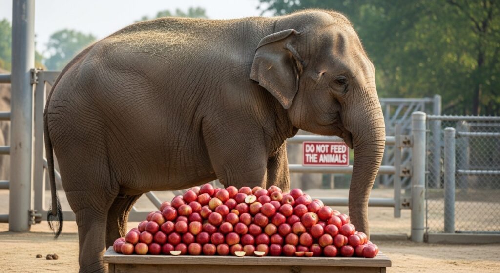 ダンボの食事は、リンゴ、ニンジン、干し草、そして象用の固形飼料。毎日200キロ近い量を食べるのですが、私たちが近くにいる間は、決して食べようとしません。