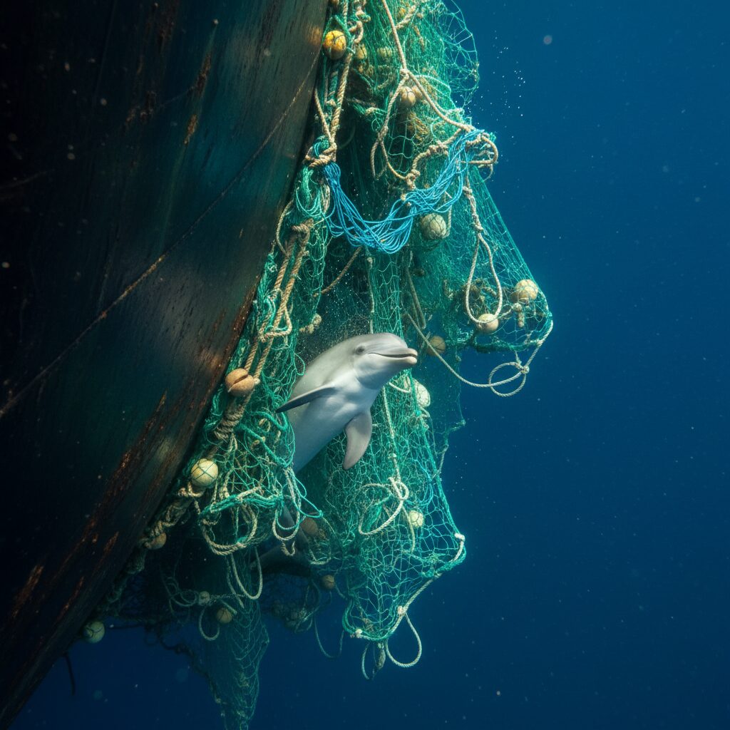 船底カメラには、船体に絡みついた巨大な漁網が映っていた。しかしそれだけではなかった。網の中で、一頭の子イルカがもがいていたのだ。「なんてこと…」サラは呟いた。イルカの群れは、仲間を助けてほしいと訴えていたのだ。船長のマイケル・ドノヴァンがブリッジから降りてきた。「どうする?」彼の問いに、サラは迷わず答えた。「助けます。すぐに」ジェイクは既にダイビング装備の準備を始めていた。外では、イルカたちが鳴き声を上げ続けていた。まるで人間に懇願しているかのように。