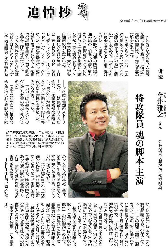 今井さんを語る上で欠かせないのが、「自衛官時代の癖」という張りのある声。そして特攻隊員が主人公で「生きる」をテーマにした戯曲「THE WINDS OF GOD」の存在。自衛隊としての任期は短かったかもしれませんが、国を守るという意志は確実に芸能生活にも反映されています。