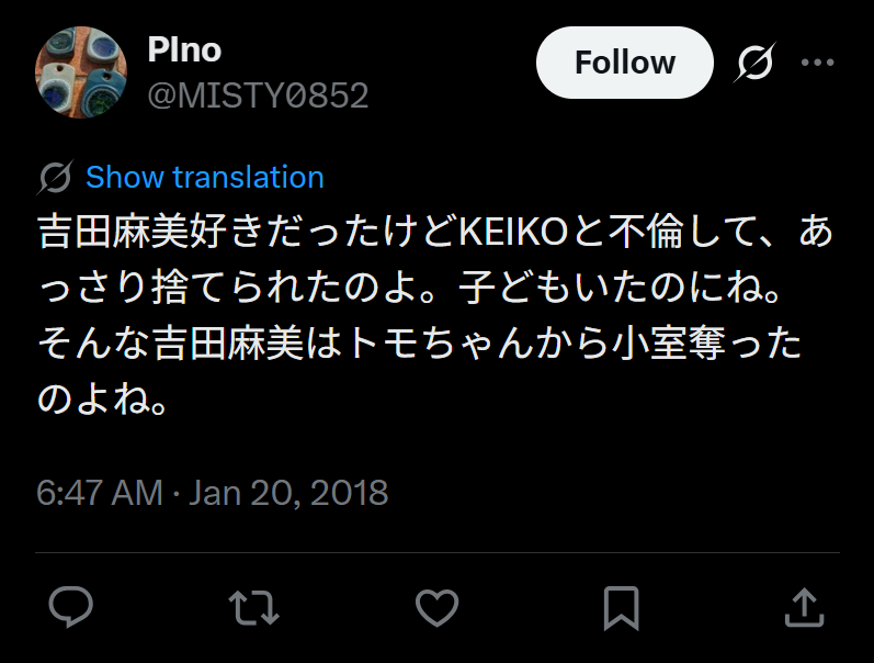 しかしわずか10か月後に離婚。Asamiさんによると、結婚から5カ月ほどたち、そろそろ出産で入院しようという頃に小室さんの態度がよそよそしくなってしまったのだそう。その頃には「globe」のKEIKOさんと不倫していたそうで、相手を知った時の怒りは相当なものだったと話しています。