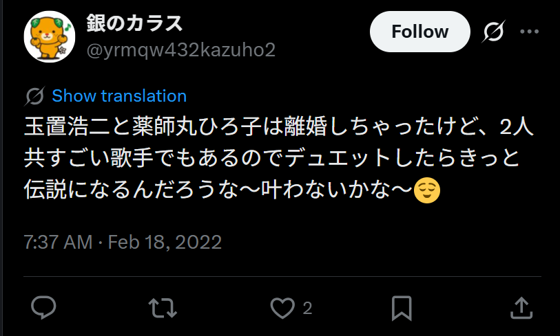 玉置浩二さんは、ロックバンド「安全地帯」のボーカル。薬師丸ひろ子さんは、角川映画で活躍した女優であり歌手。2人は1991年に結婚しましたが、1998年に離婚しています。87年に玉置さんが薬師丸さんの歌を作曲した縁から結婚し、人気絶頂の2人の結婚は大きな話題となりました。
