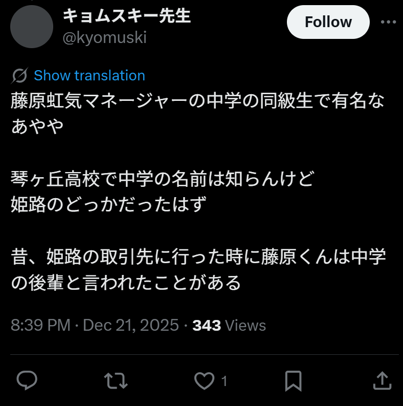 松浦亜弥さんは、「あやや」の愛称で親しまれているタレントであり歌手。藤原虹気さんは、西武ライオンズに所属していた元プロ野球選手。2人は、姫路市立城山中学校時代の同級生だったといいます。