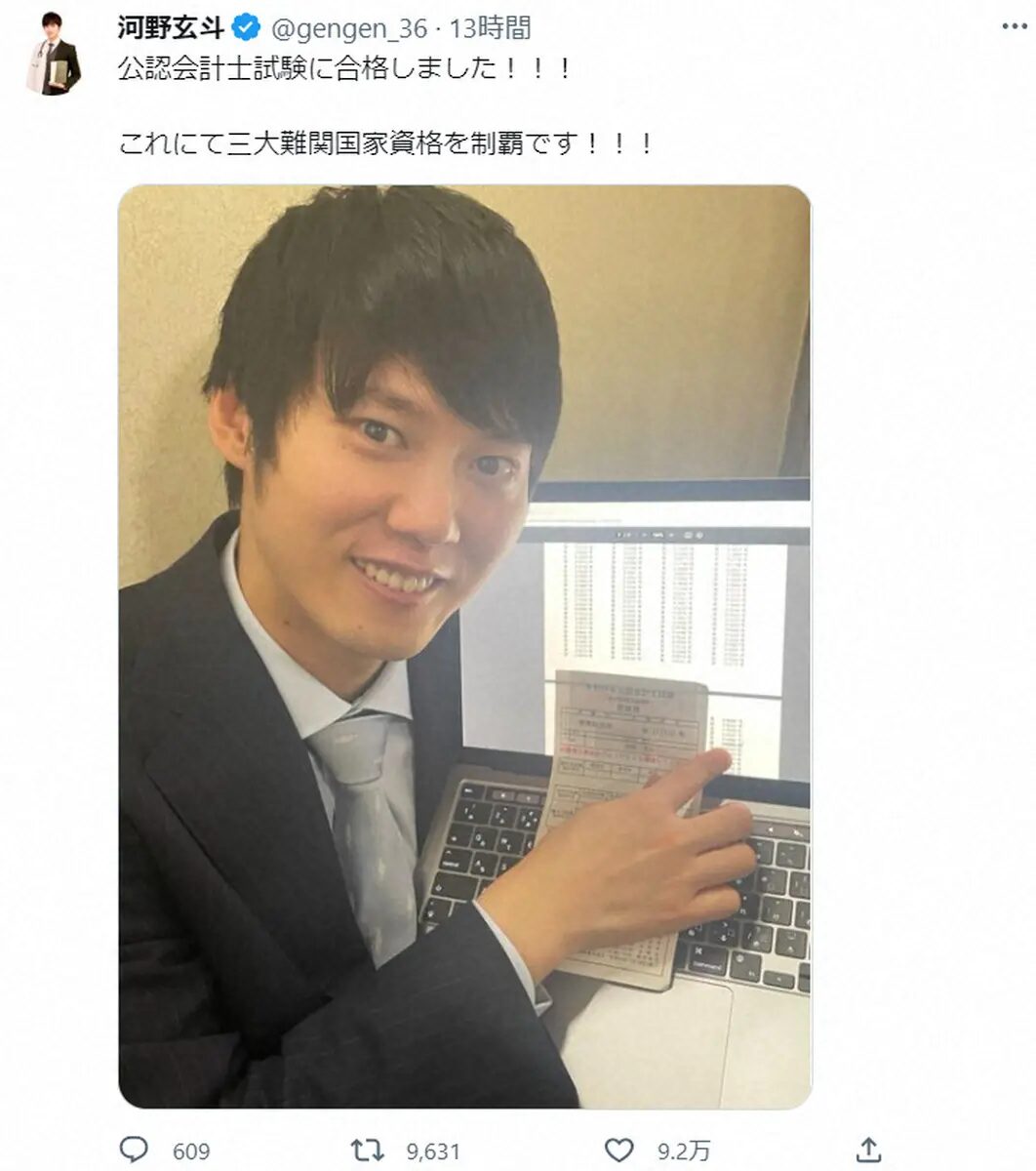 河野玄斗さんは、2018年に放送された「頭脳王」で注目されたクイズタレントであり実業家。東京大学理科三類を現役で合格し、在学中に司法試験と医師国家試験にも合格しています。更に2022年には公認会計士の資格も取り、難題な三大資格を20代半ばで取得しました。