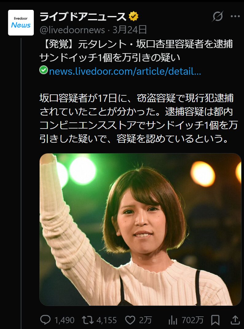 母が死去した後の坂口杏里さんは精神的に不安定になり、ホストにハマりホスト宅に侵入した罪で2017年に逮捕されています。そして2026年3月には、コンビニで300円のサンドイッチを万引きし逮捕されました。